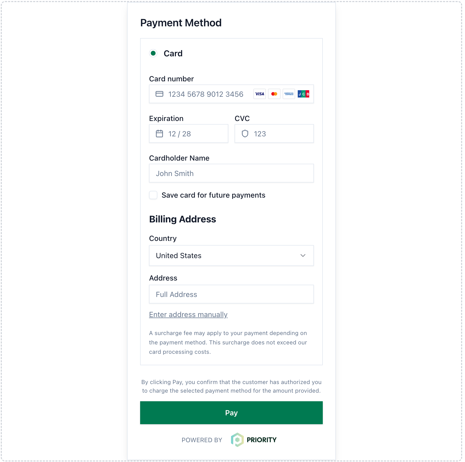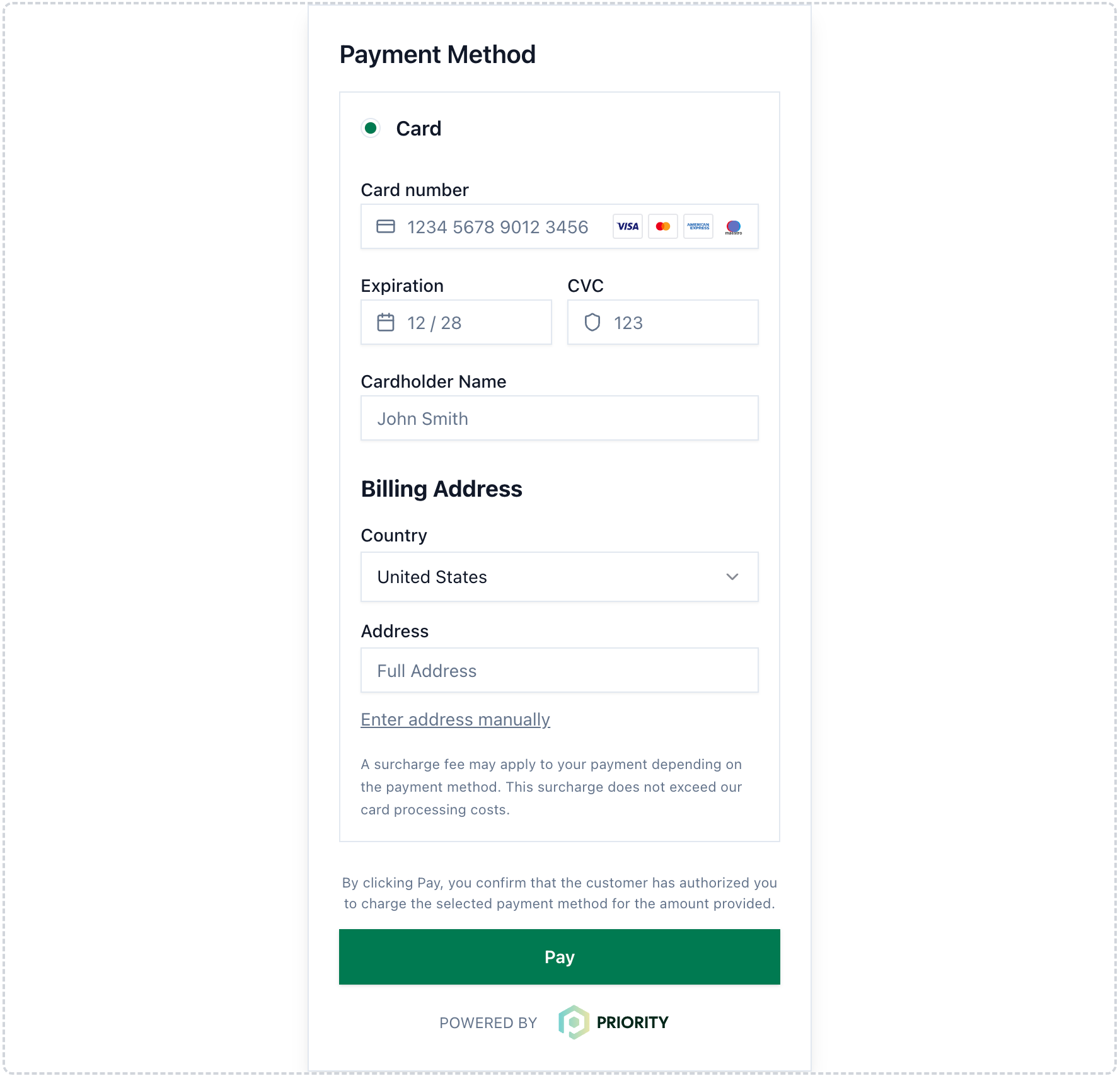 - PCI-compliant tokenization and authentication are handled entirely by Priority.