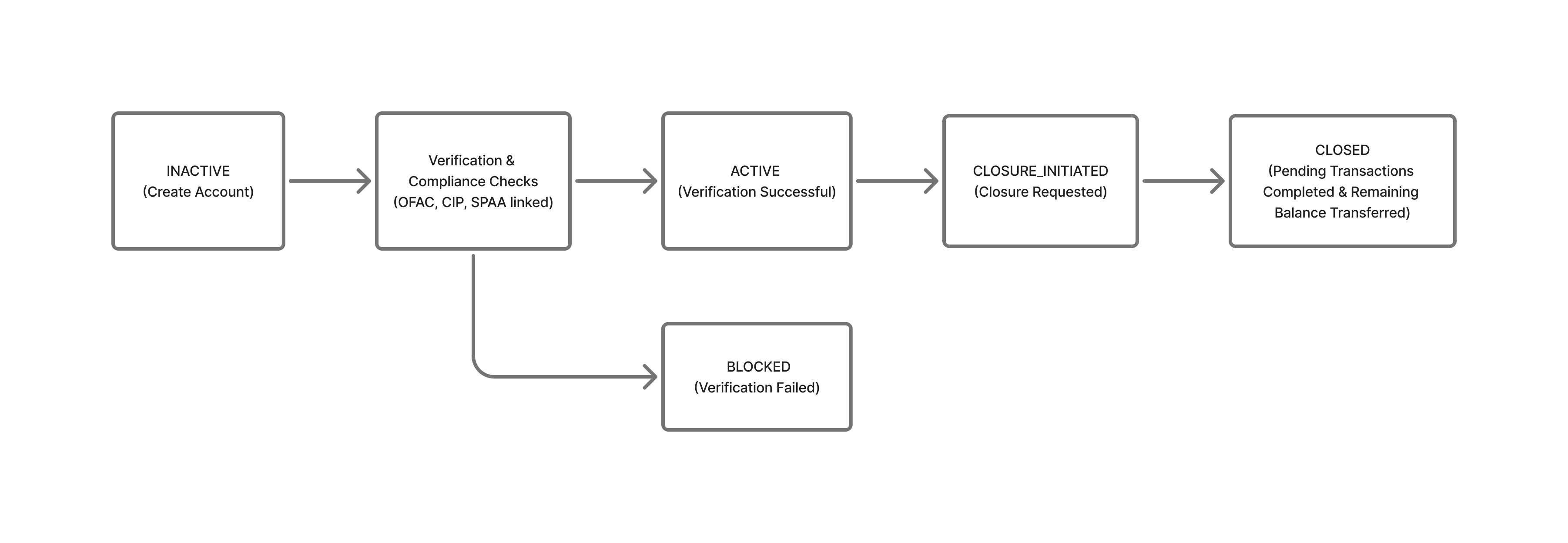 Customer verification failed | If OFAC or CIP verification fails, the account will not be activated and may transition to BLOCKED status. |