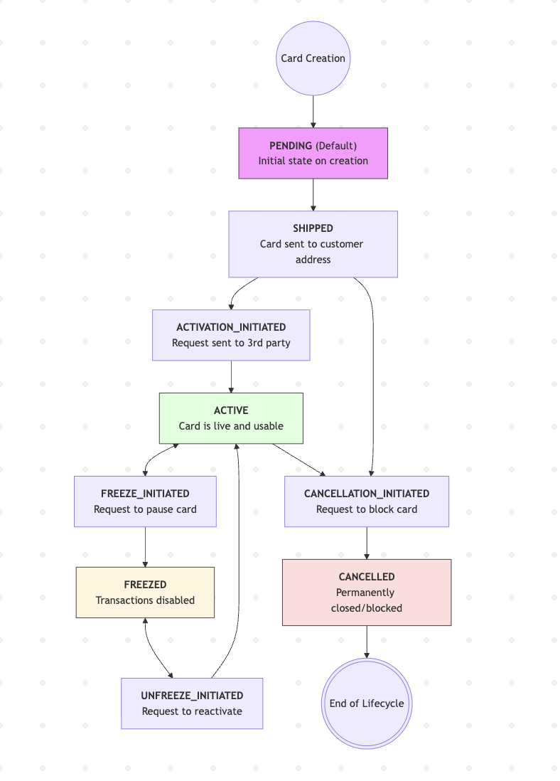 - FREEZE_INITIATED / FREEZED: The card is temporarily "paused." All transactions will be declined. This is ideal for misplaced cards or security precautions.